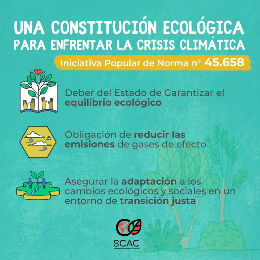 El documento es el resultado de un esfuerzo colaborativo de diversas organizaciones nacionales que son parte de la SCAC, quienes durante meses se reunieron para la redacción de la Iniciativa Popular de Norma “Una Constitución Ecológica para enfrentar la crisis climática”, la cual quedó fichada con el número 45.658. En esta se busca incorporar elementos que hagan de la nueva Carta Magna una herramienta útil ante la emergencia climática y ecológica en nuestro país.