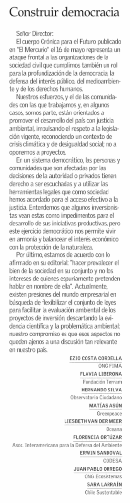 El cuerpo Crónica para el Futuro publicado en “El Mercurio” el 16 de mayo representa un ataque frontal a las organizaciones de la sociedad civil que cumplimos también un rol para la profundización de la democracia, la defensa del interés público, del medioambiente y de los derechos humanos.