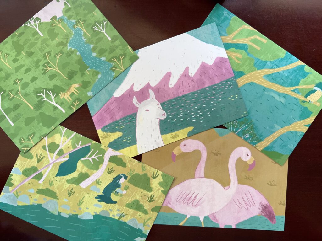 Desde el norte del país, nuestras ilustraciones evocan la majestuosidad del Lago Chungará, con sus aguas de altura, volcanes y fauna adaptada a condiciones extremas, símbolo de la fragilidad y belleza de los ecosistemas altoandinos. A él se suma el Salar de Surire, hogar de flamencos y otras especies que dependen de este ambiente único para sobrevivir.