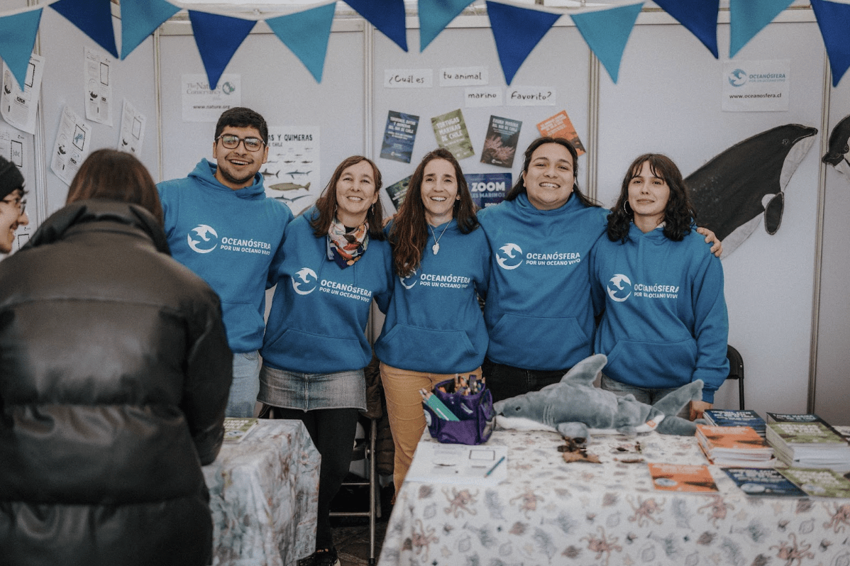 El equipo de Oceanósfera en una feria de ciencias en Valdivia, en el sur de Chile, en 2023. La fundación ha desarrollado más de 20 recursos educativos marinos como libros, juegos y afiches (Imagen: Pablo Lloncón)